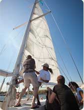 Your team will be divided into smaller groups to learn the basics of sailing, communication, and teamwork. After training, the entire team will work together to sail and successfully navigate around a course.