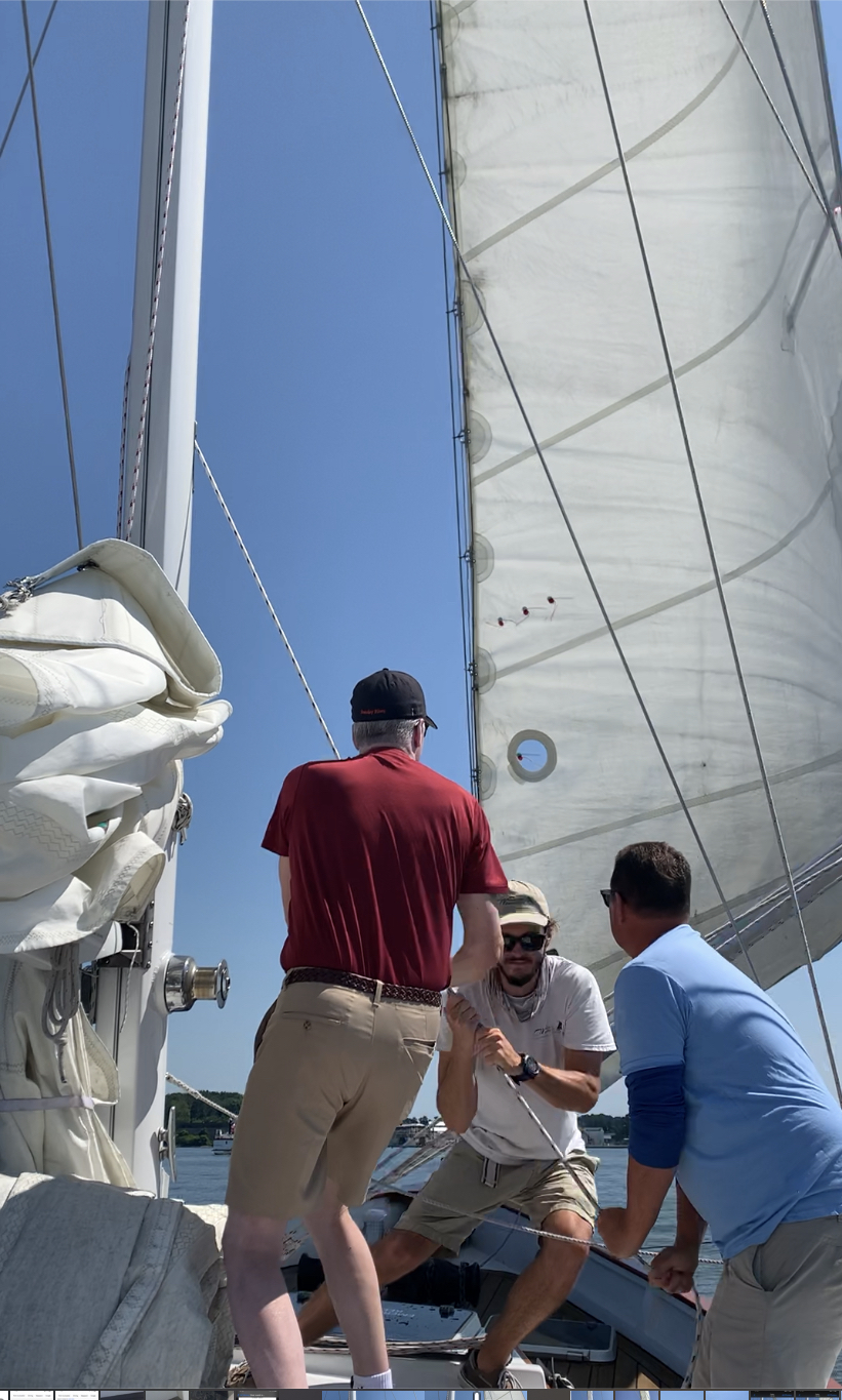 Woodwind crew member Ed and passengers raising the sail on July 21, 2023. Photo by Laura Stanzilis of Mount Arlington, New Jersey