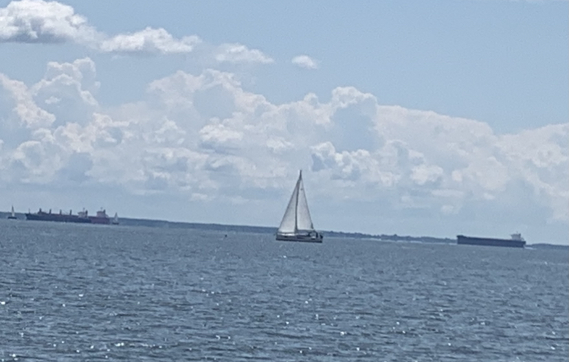 A sailboat glides by container ships waiting to enter the port. Photo by Michael Stanzilis of mount arlington, NJ