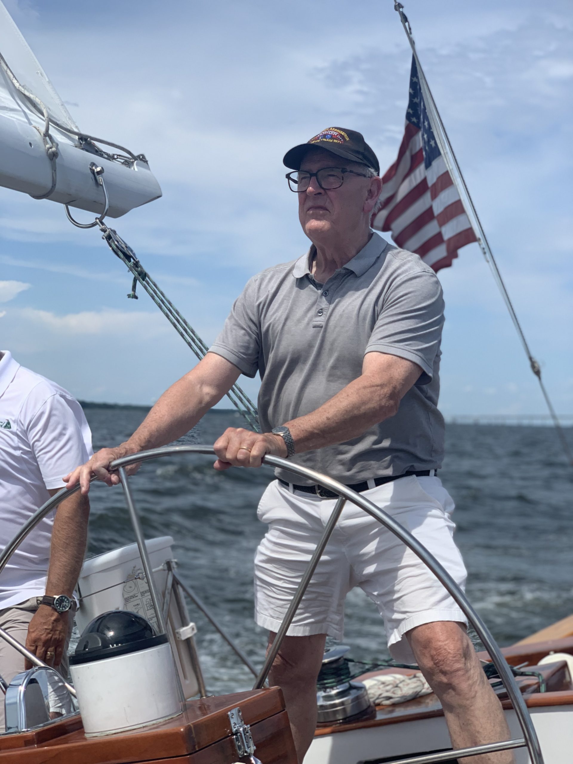 Joe McElroy having turn at the wheel on the Woodwind Schooner II on July 14 on the 1:30pm outing. Photo by Joe McElroy of Haddonfield, NJ