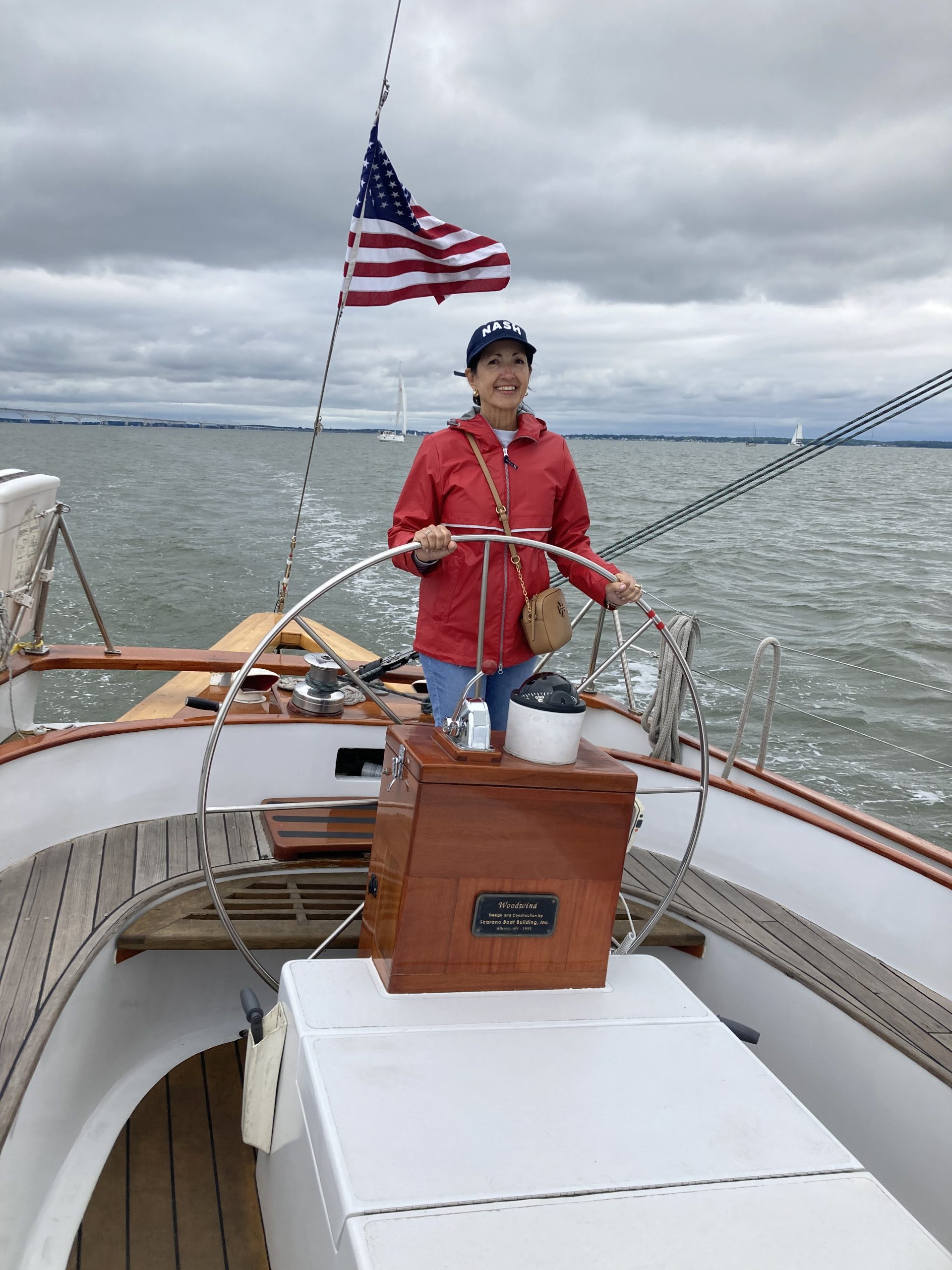 Captain Lorraine takes the helm on a great day for sailing the bay! Photo by Adam Yeomans of Franklin, TN