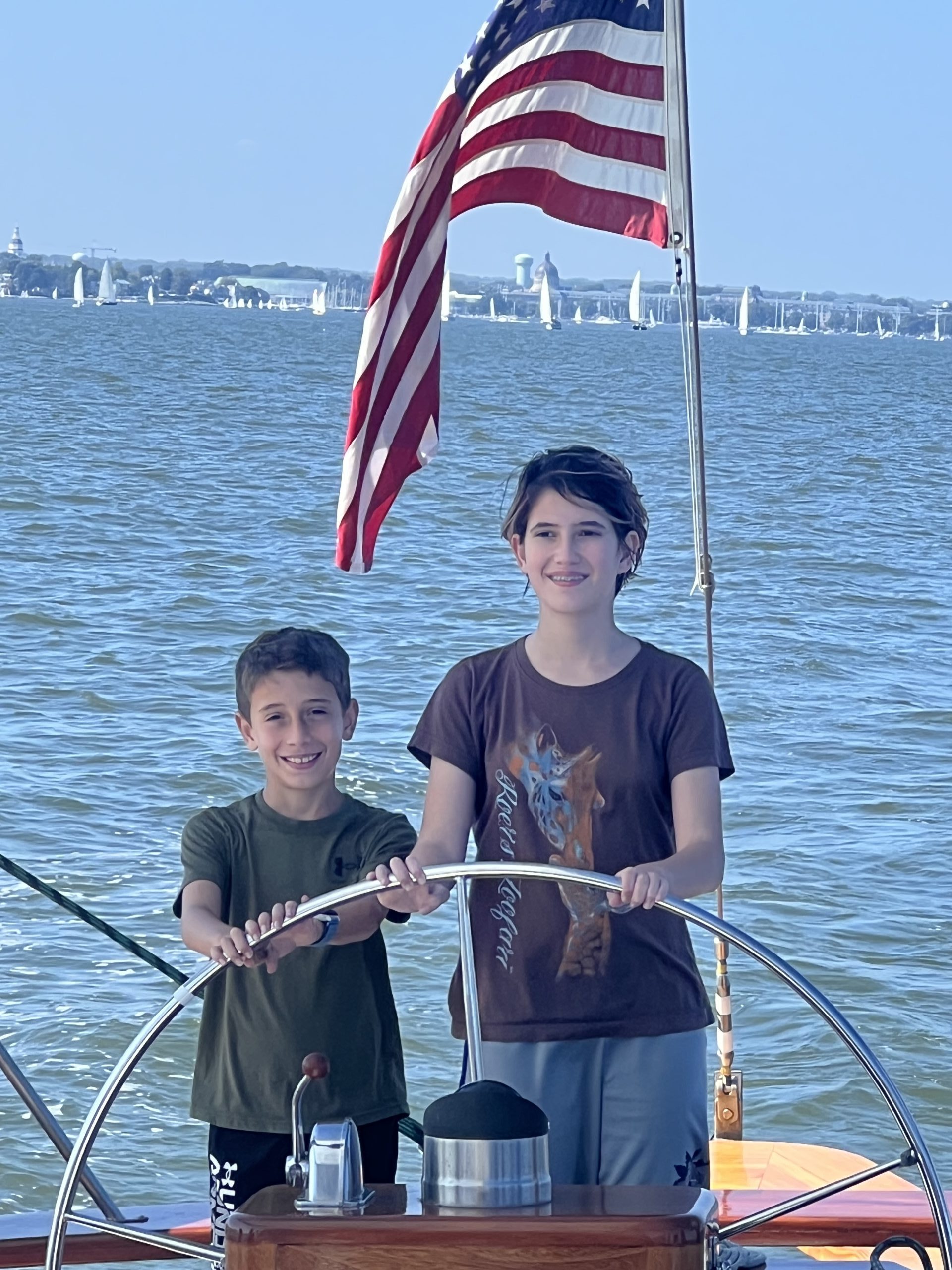 My children, Ray (12) and Ben (10), take the helm while celebrating their dad’s 50th birthday on the Schooner Woodwind 10/1/23. Photo by Alison French of Vienna, VA