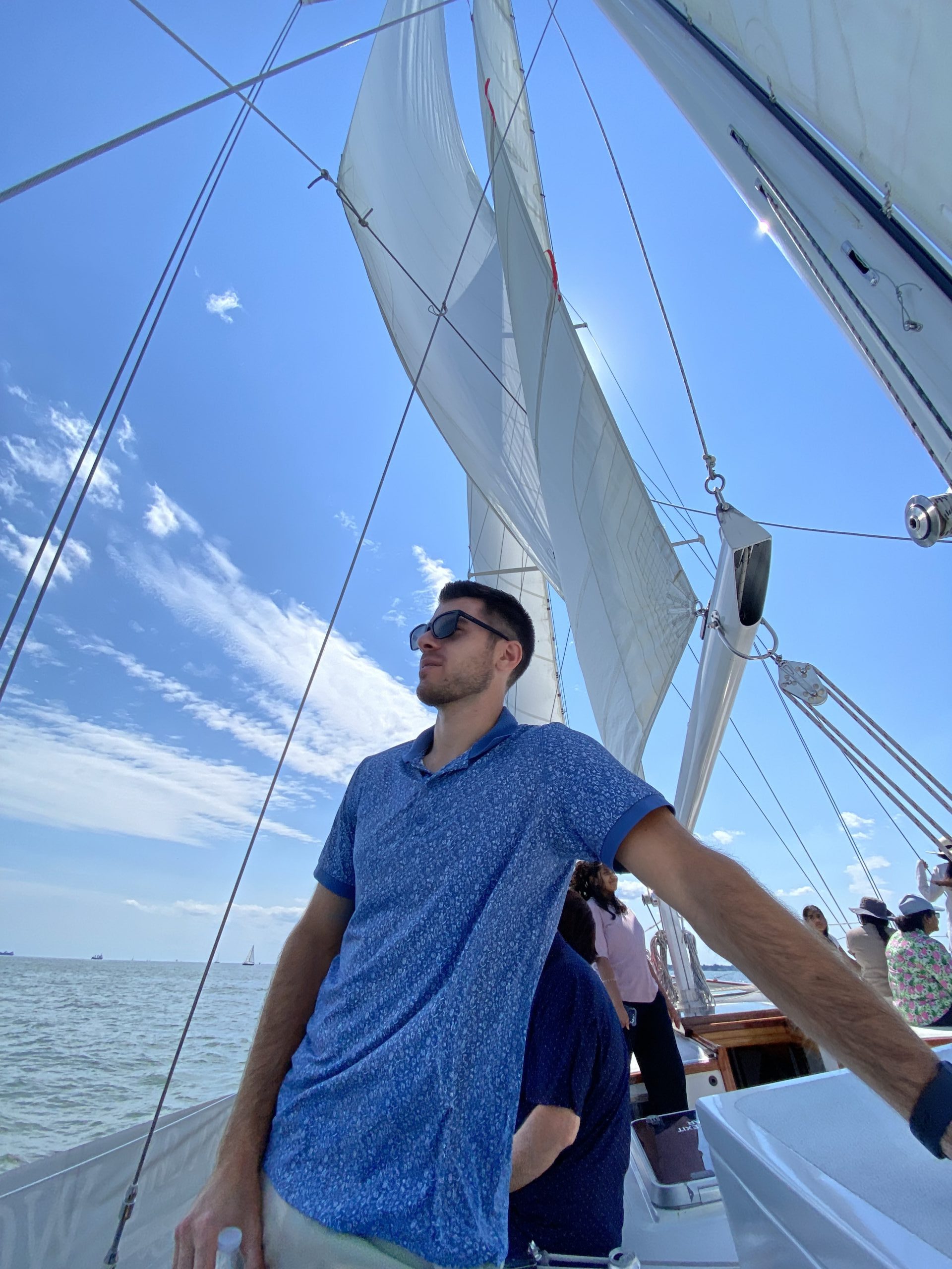 Man stands on sailboat taking in the views Photo by Michelle Ahlberg of Philadelphia, Pennsylvania