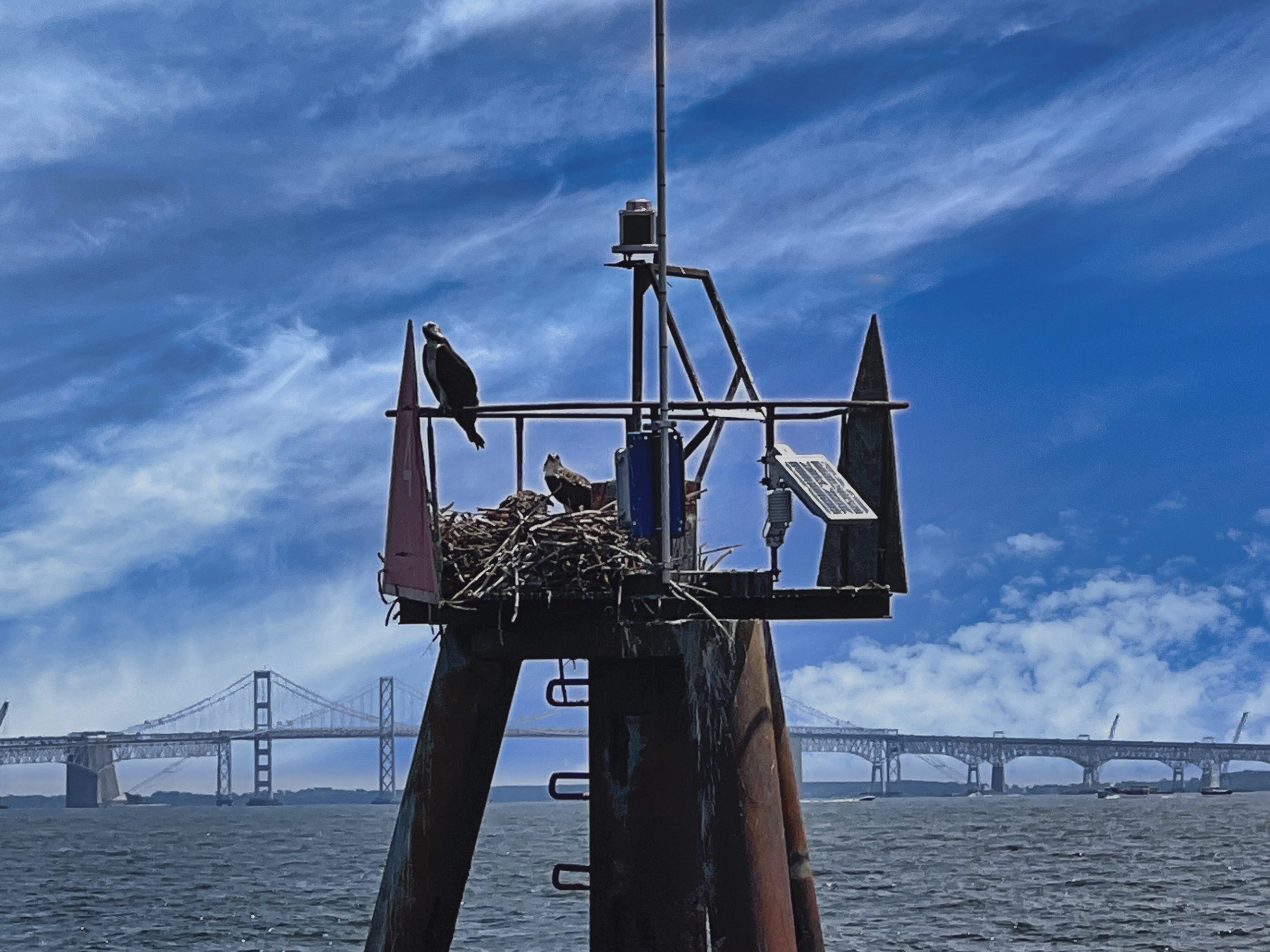 Osprey Nest with Father keeping guard and Mother feeding the baby bird. Bay Bridge in background. Photo by Edgar Donald Airey of Monkton, MD