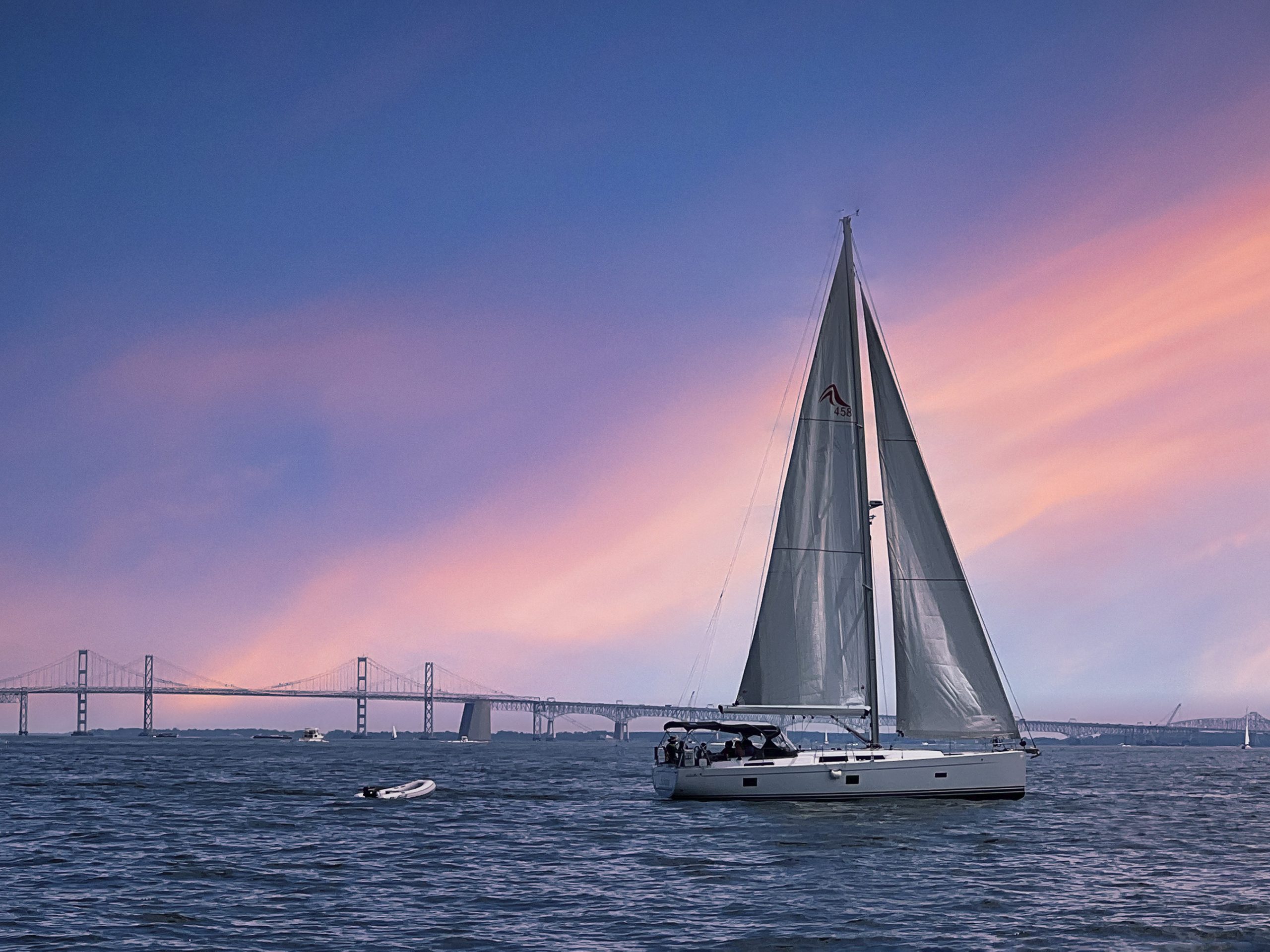 Sailboat near the Chesapeake Bay Bridge with soft pink cloud at Sunset. Shot from the Woodwind Schooner in July 2024 Photo by Lisa M. Airey of Monkton, Maryland