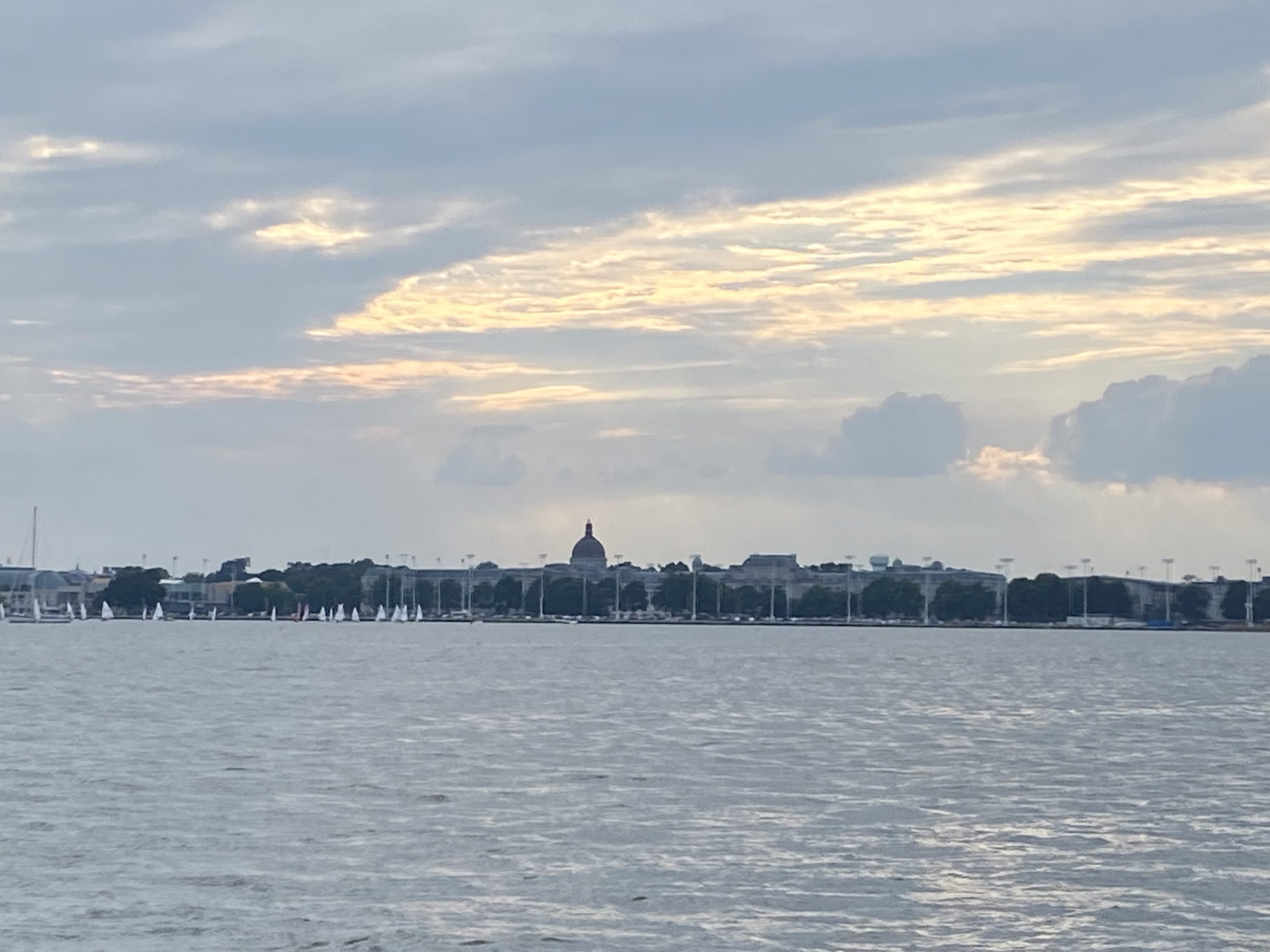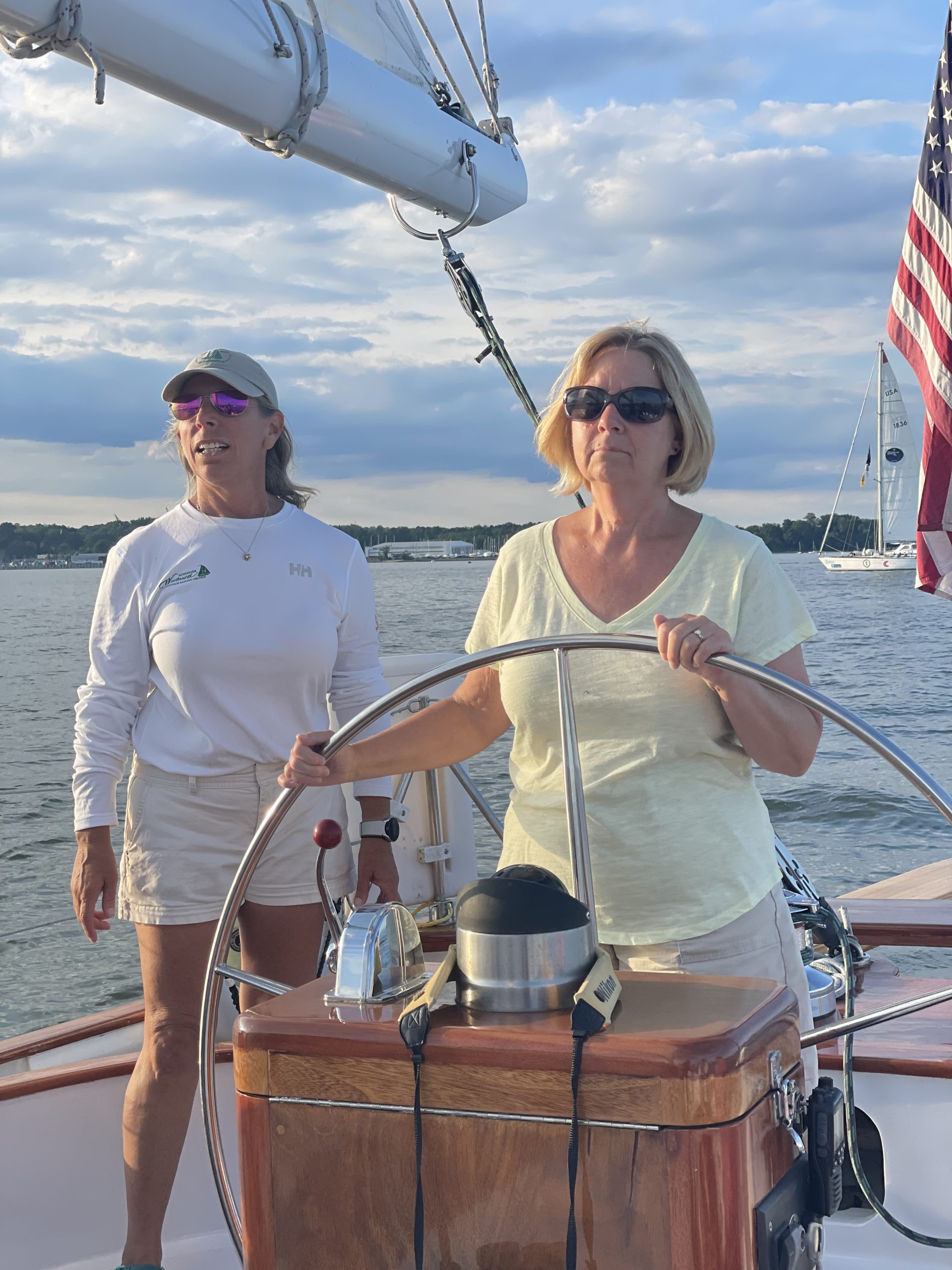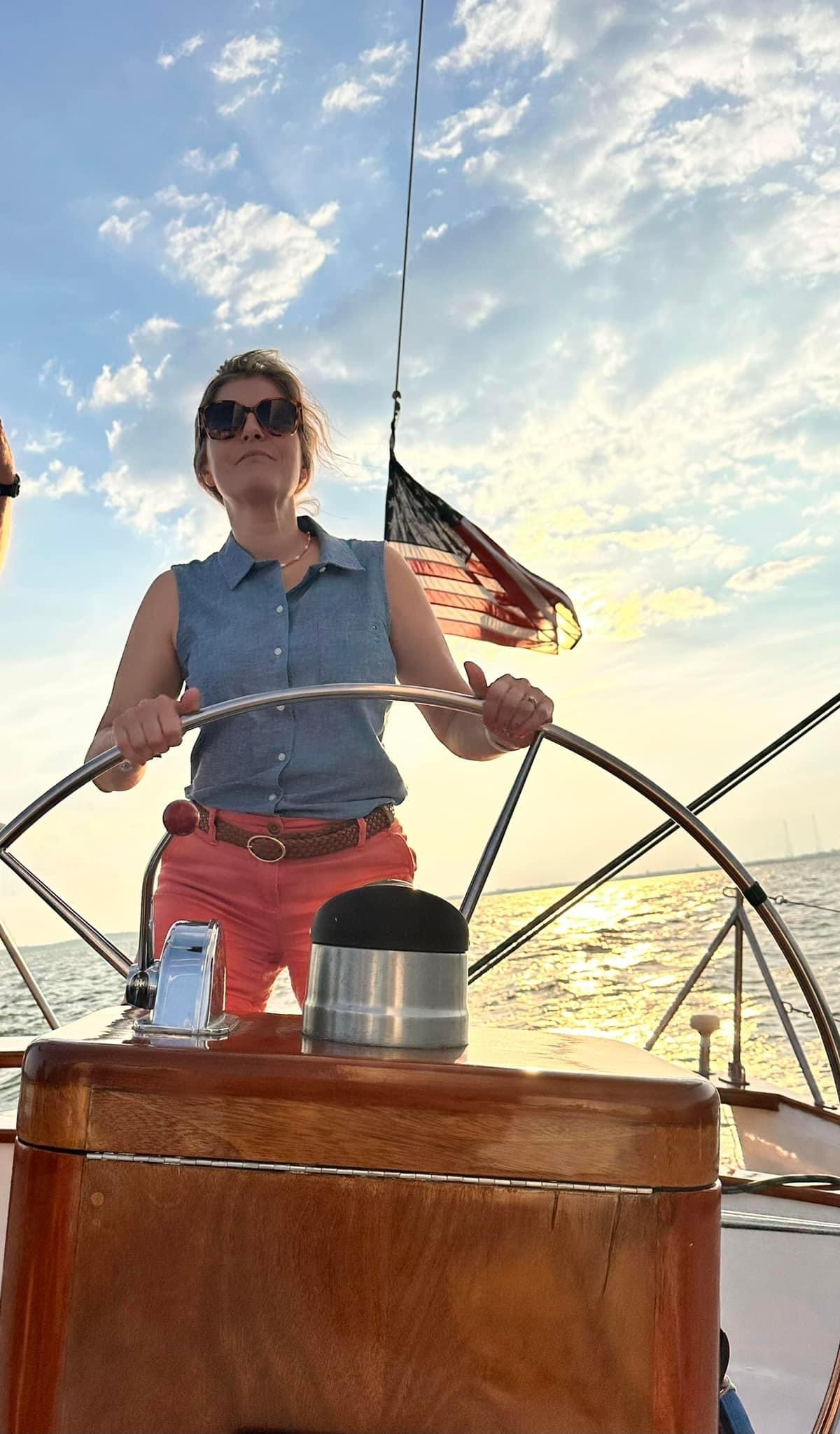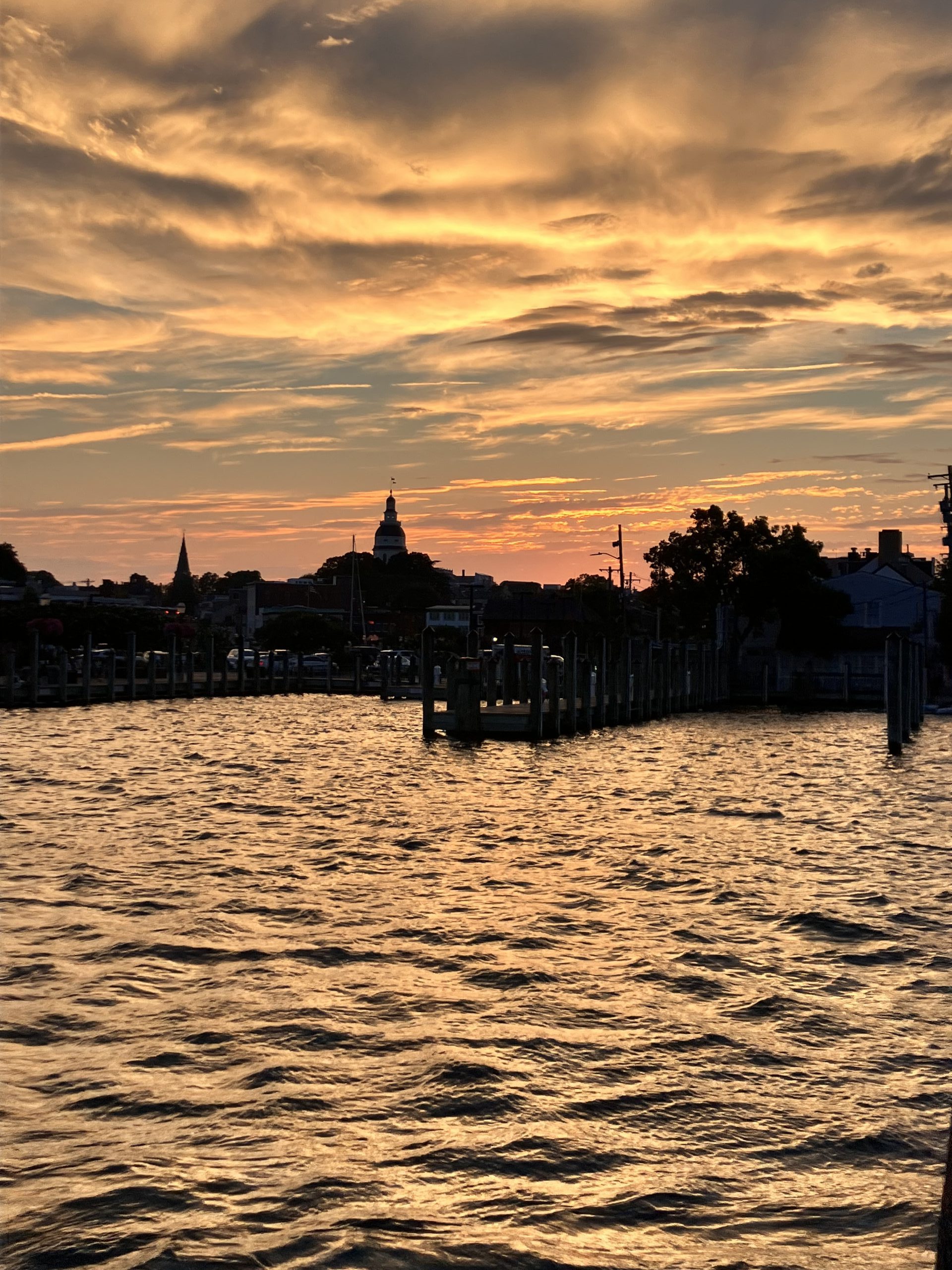 Captain and crew on a sunset cruise on July 22, 2024. I love how the boat frames the captain, crew member, and the American flag, and directs our view right out to the beautiful Chesapeake Bay. Photo by Kimberly Perry of Baltimore, MD