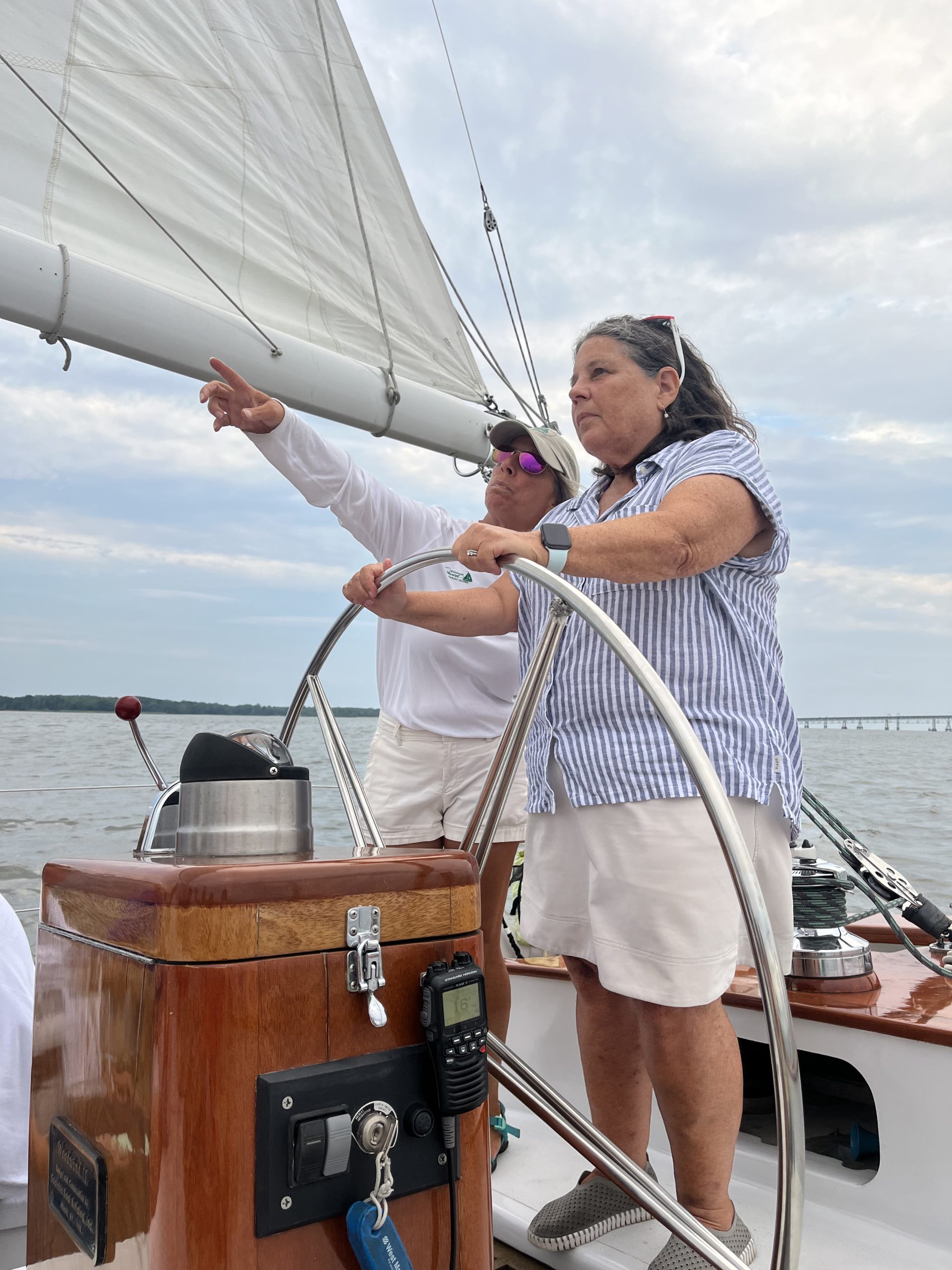 Deborah portrays confidence on her first touch of the wheel. However, we all knew that the captain is responsible for this perceived poise. Photo by Jerry Ball of Kernersville, NC