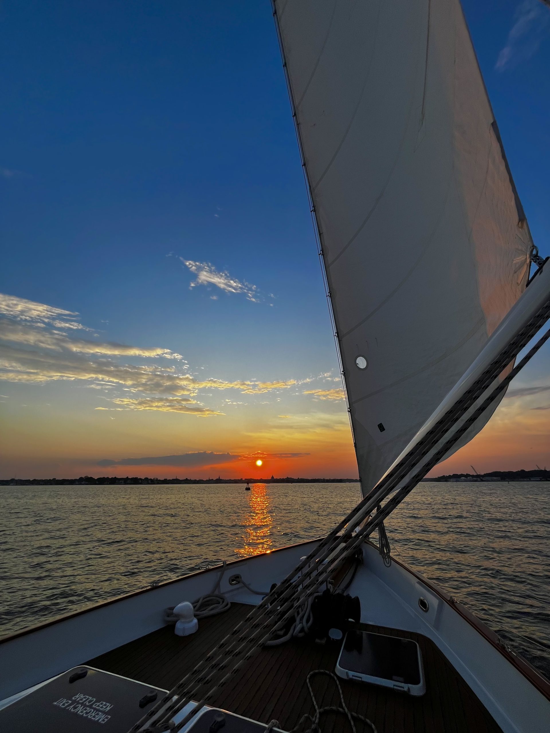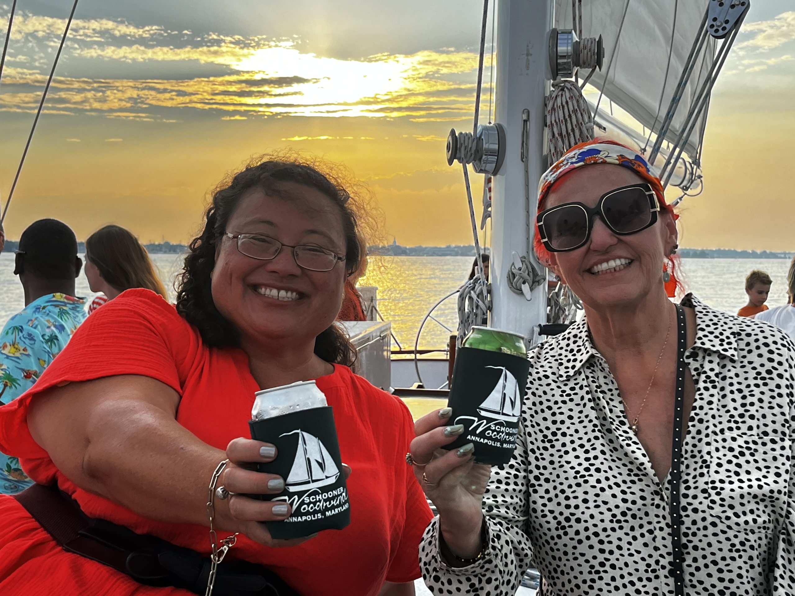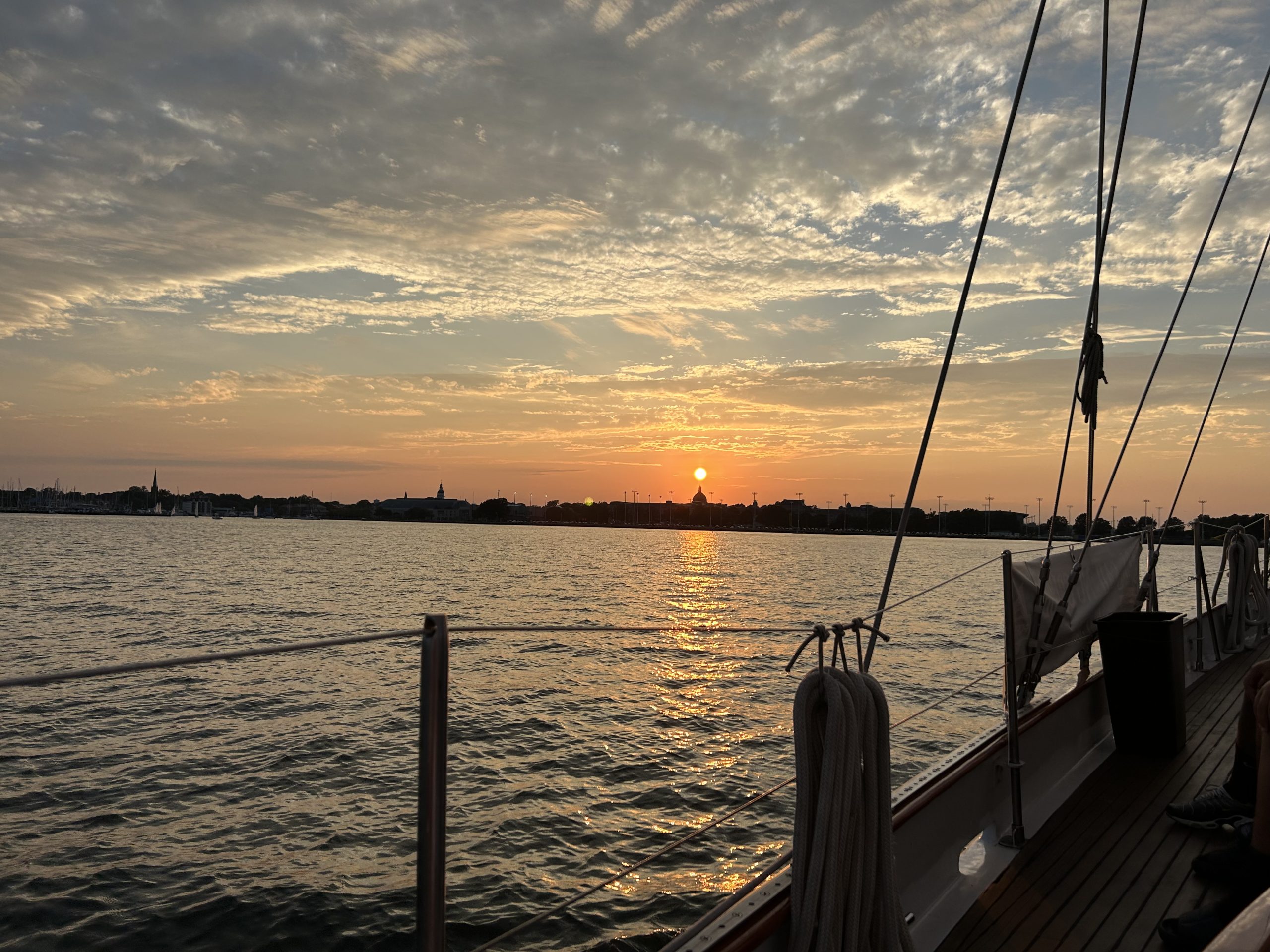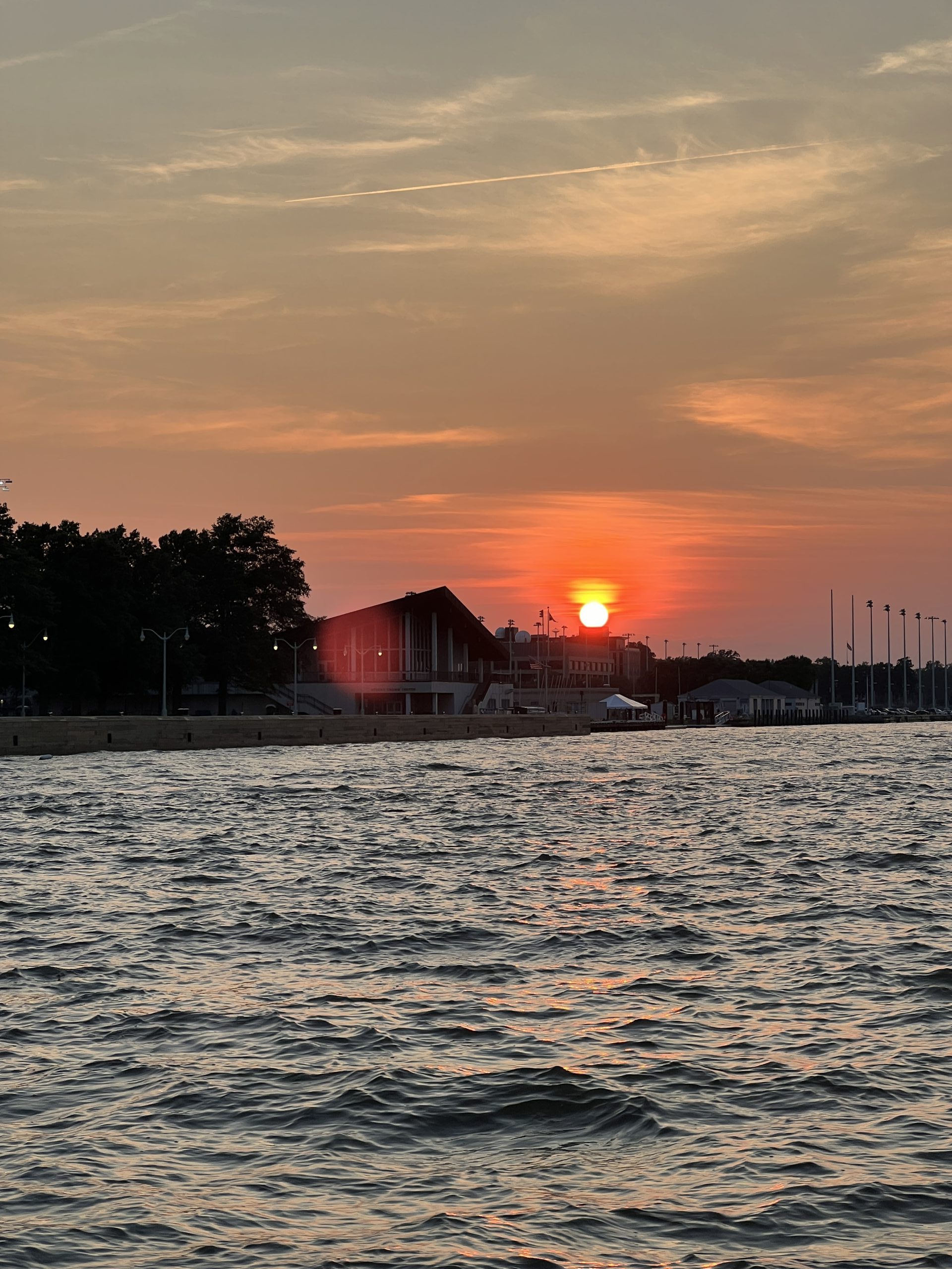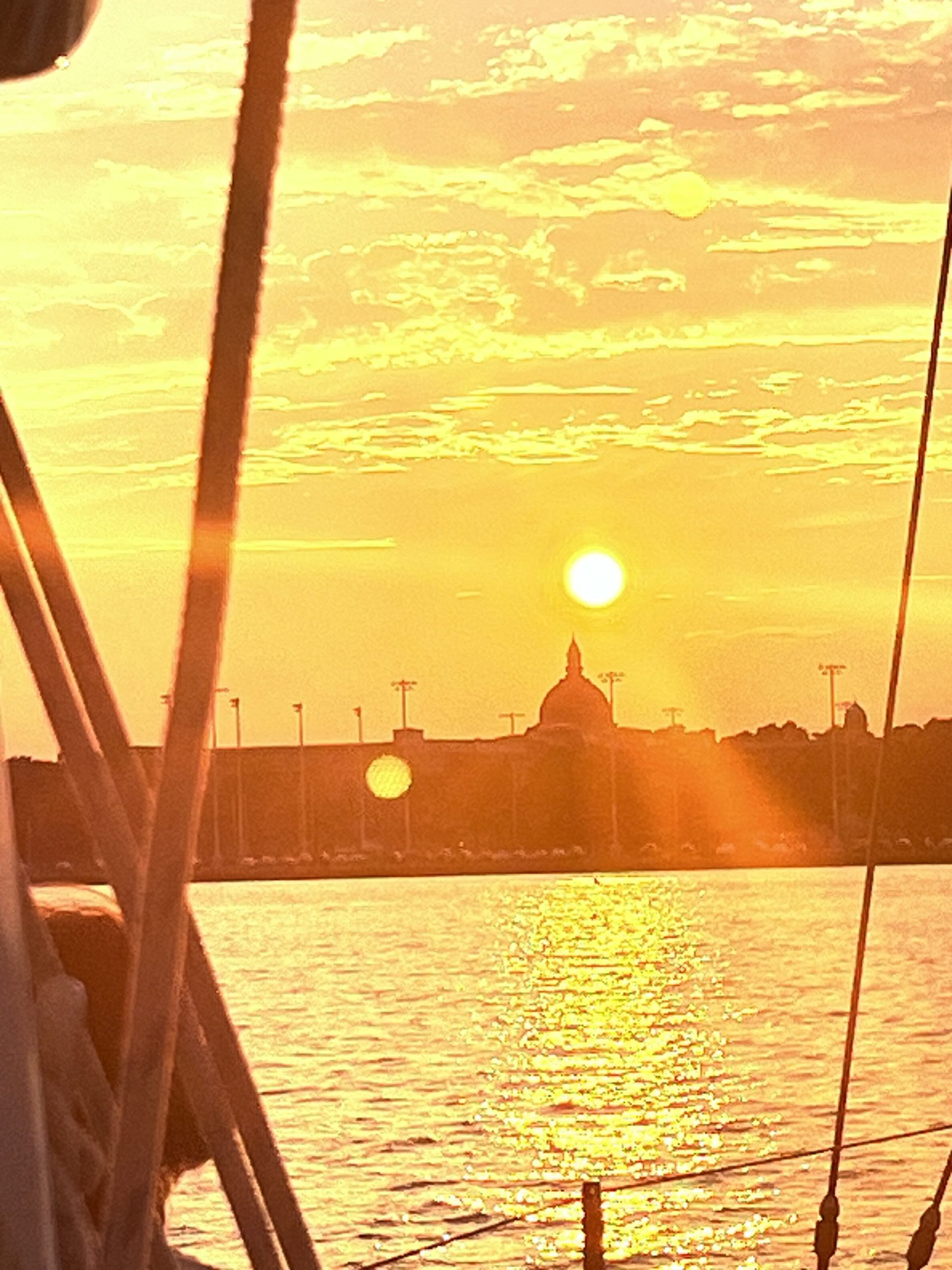 After a beautiful evening sail on July 18th aboard the Woodwind II, passengers were treated to a magnificent view featuring the fiery sun setting above the Naval Academy Chapel Dome. Photo by Susan Johnson of Annapolis, MD