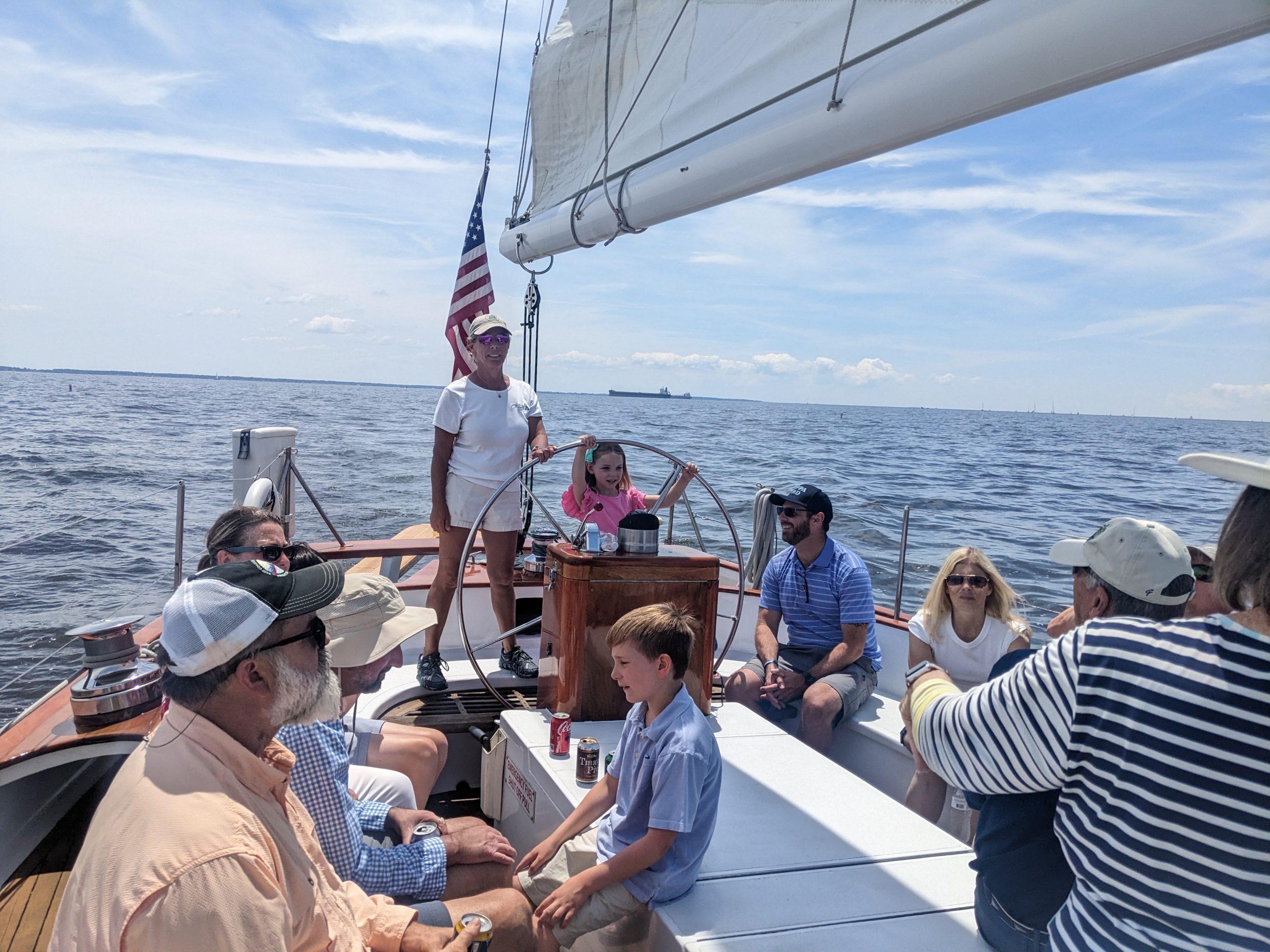 4 year old, Calista steering the Woodwind II with Captain Jen and her Daddy, Charlie on Father’s day brunch cruise. Photo by Joy Bird of Glen Burnie, MD
