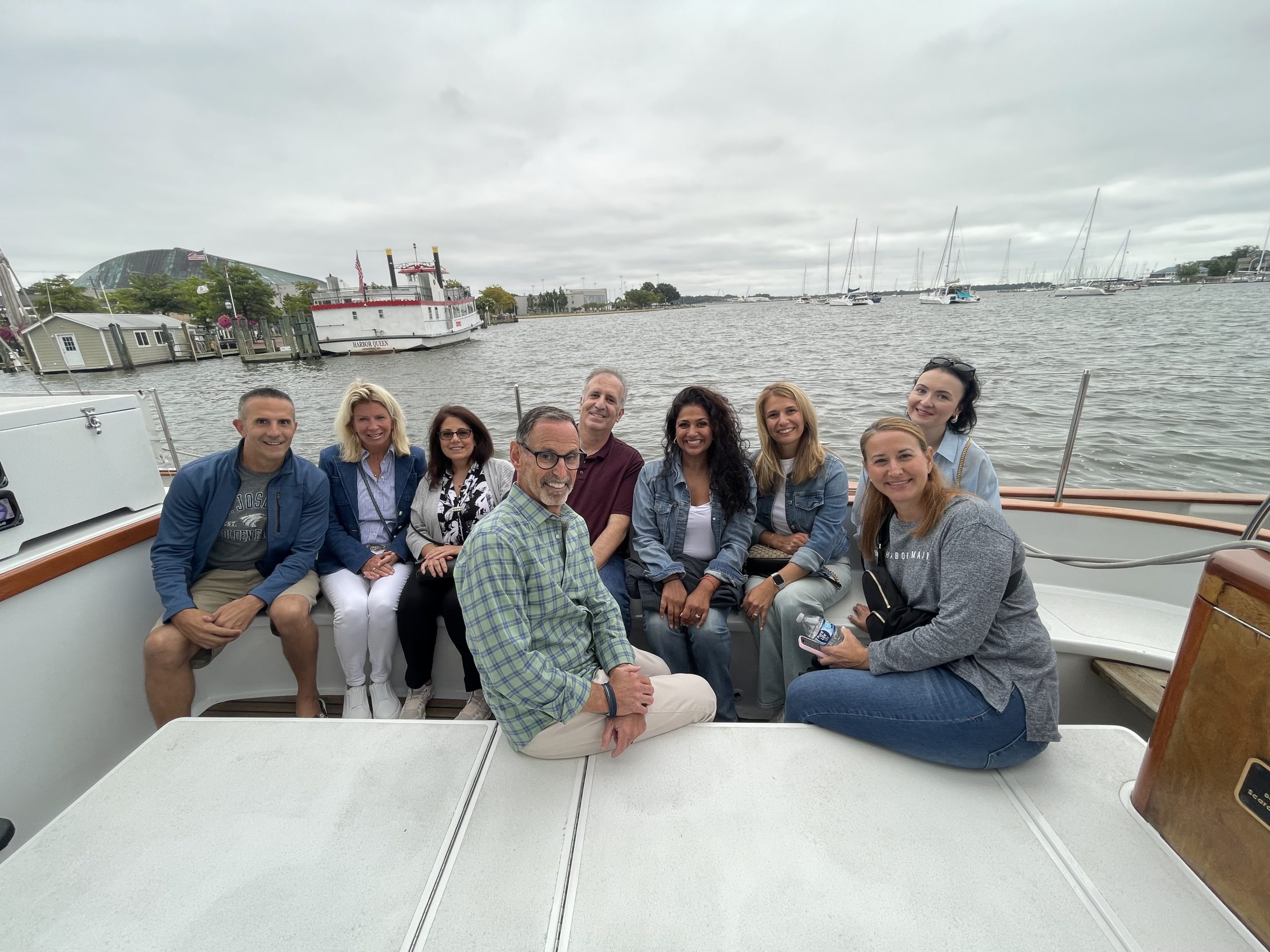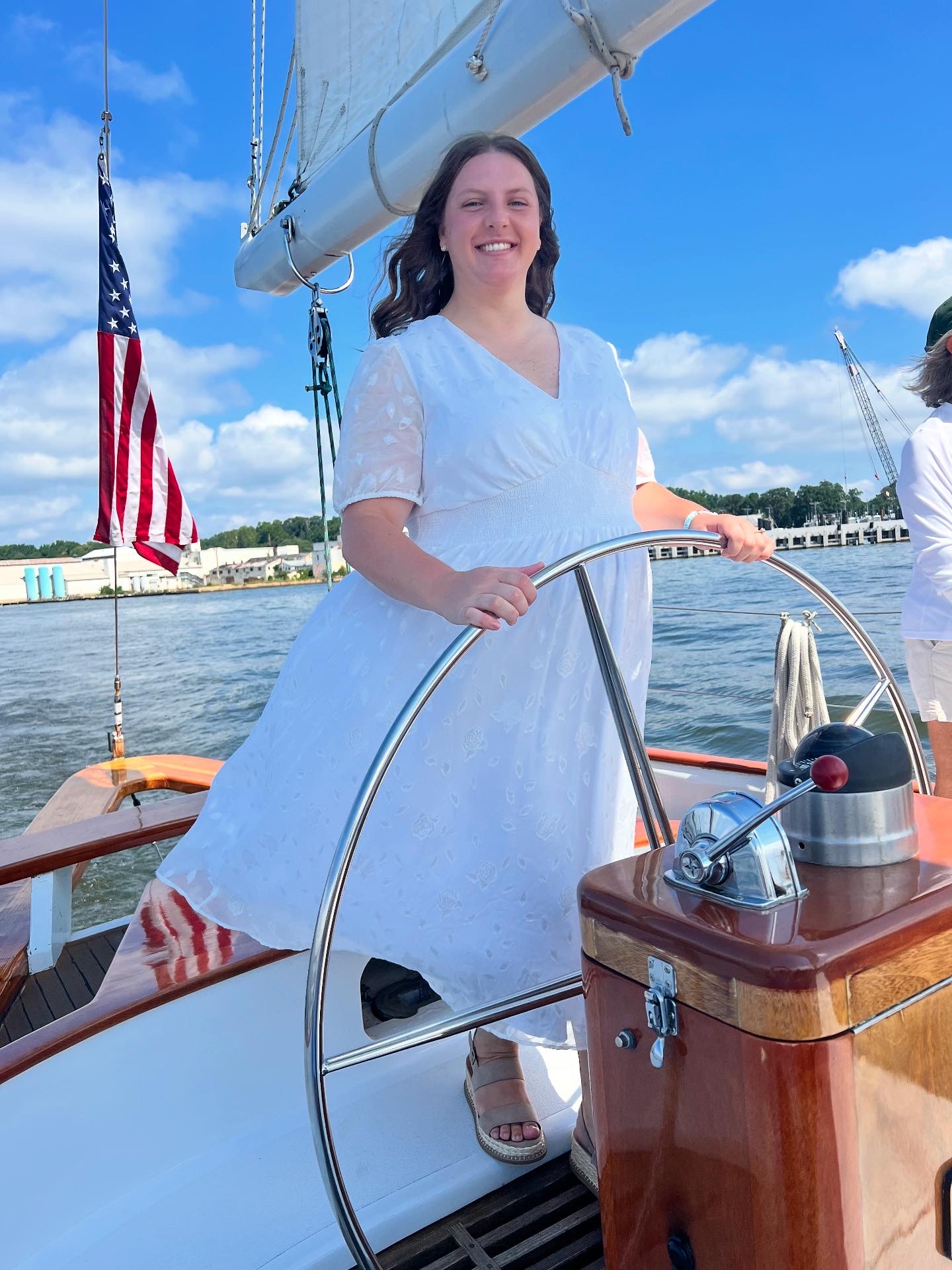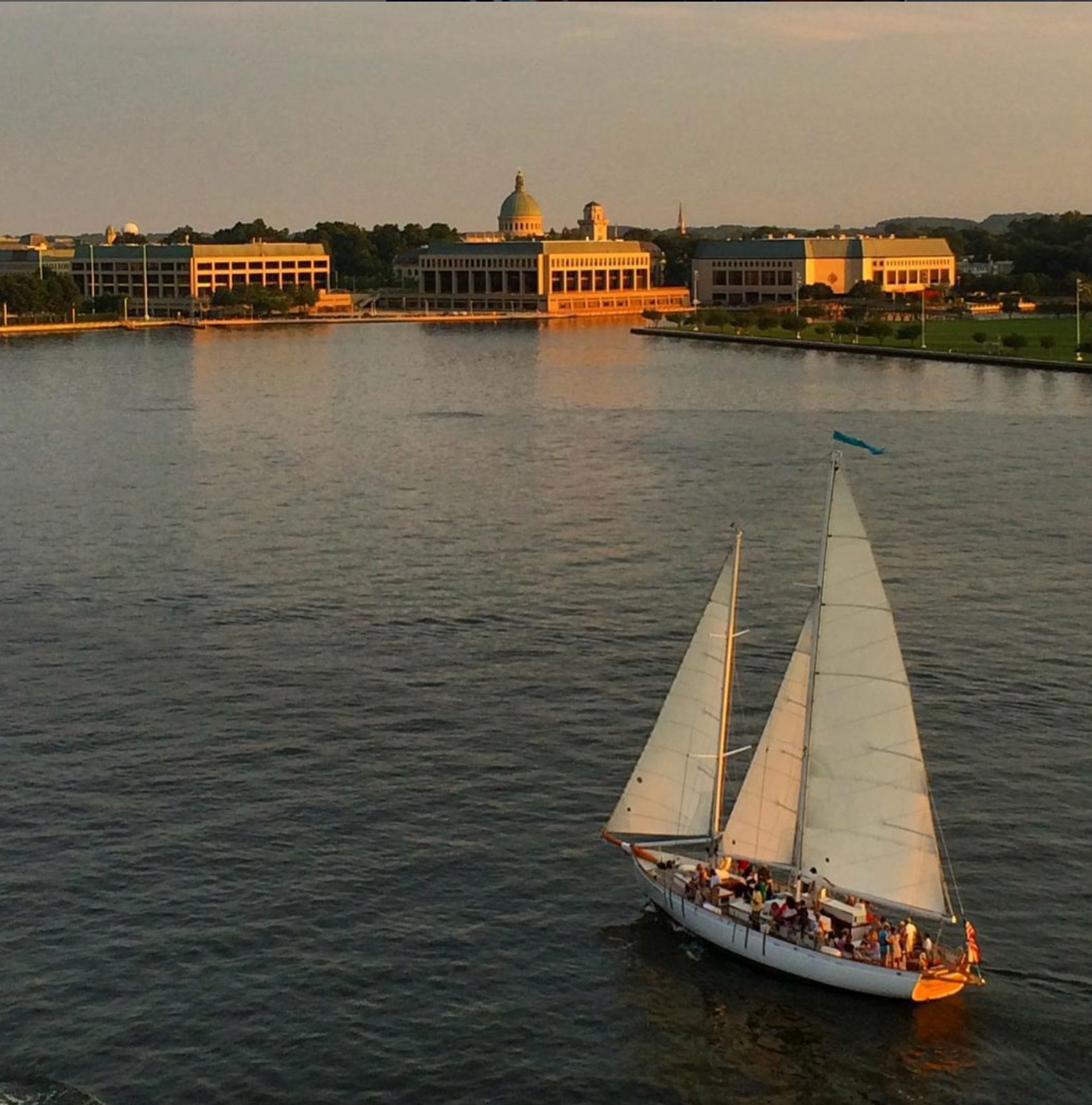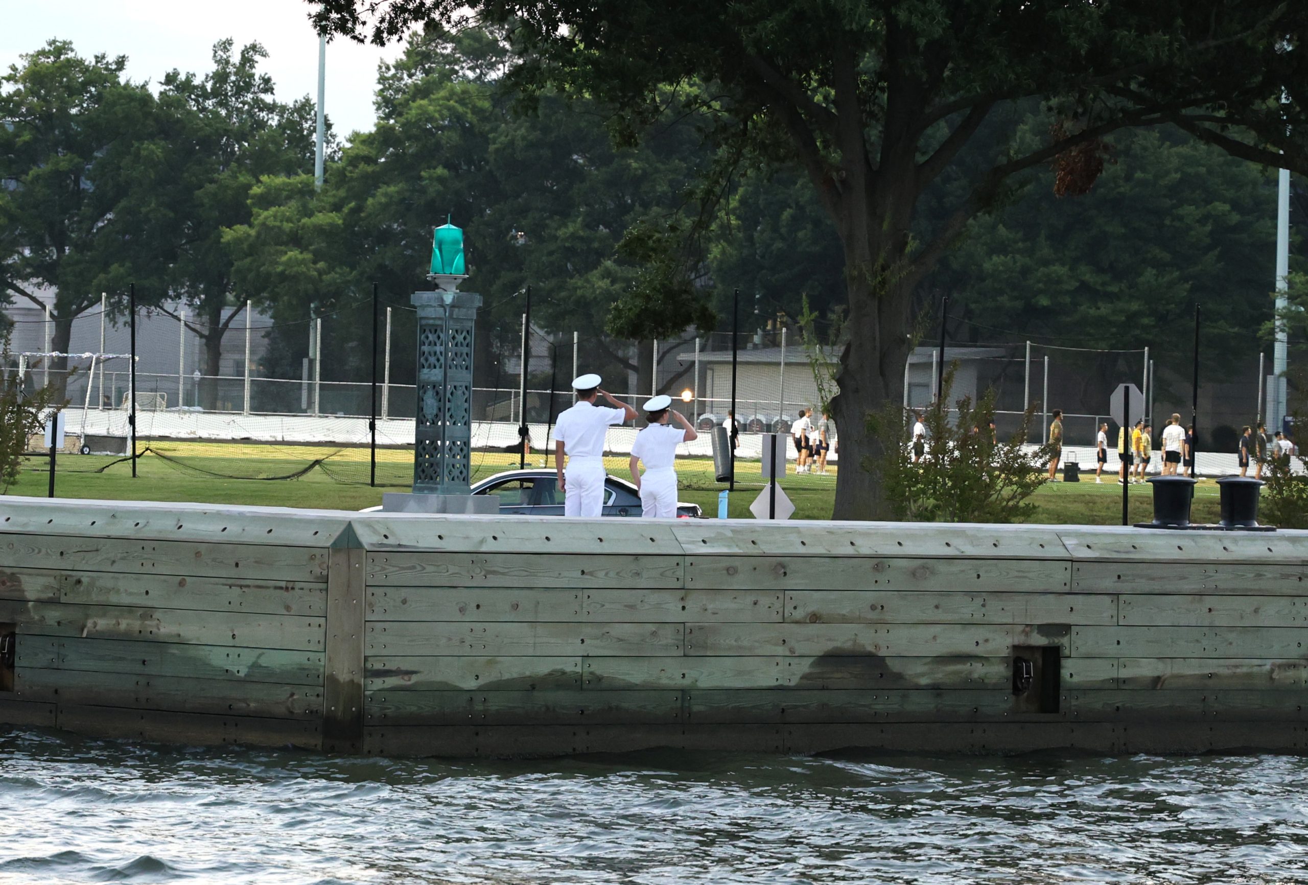 Taken while aboard the Woodwind II on August 15, 2025. As we sailed past the Naval Academy we heard Retreat, and I observed these 2 cadets standing in salute of the lowering of the flag. Photo by Stephen Canfield of Harleysville, PA