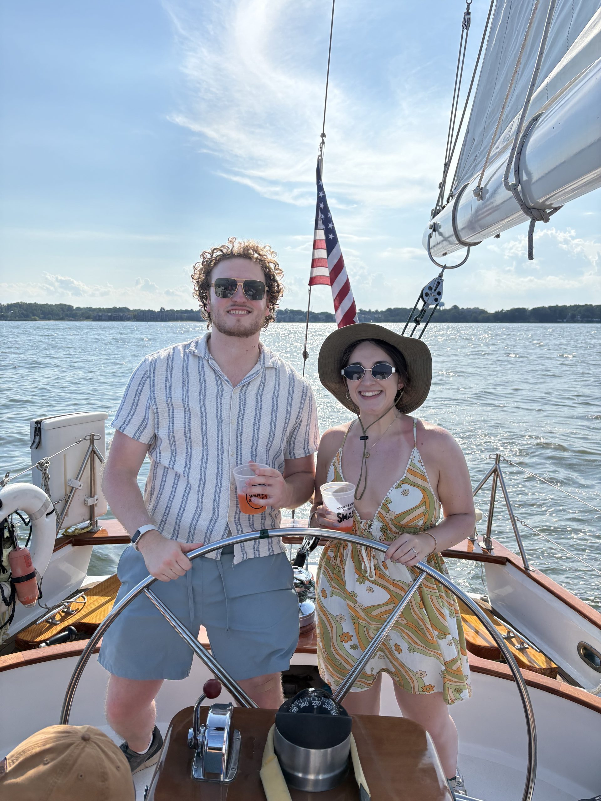 Daring to pilot as husband and wife, the couple grabs the wheel as the crew cheers them on. Photo by Kevin Robertson of Lambertville, New Jersey