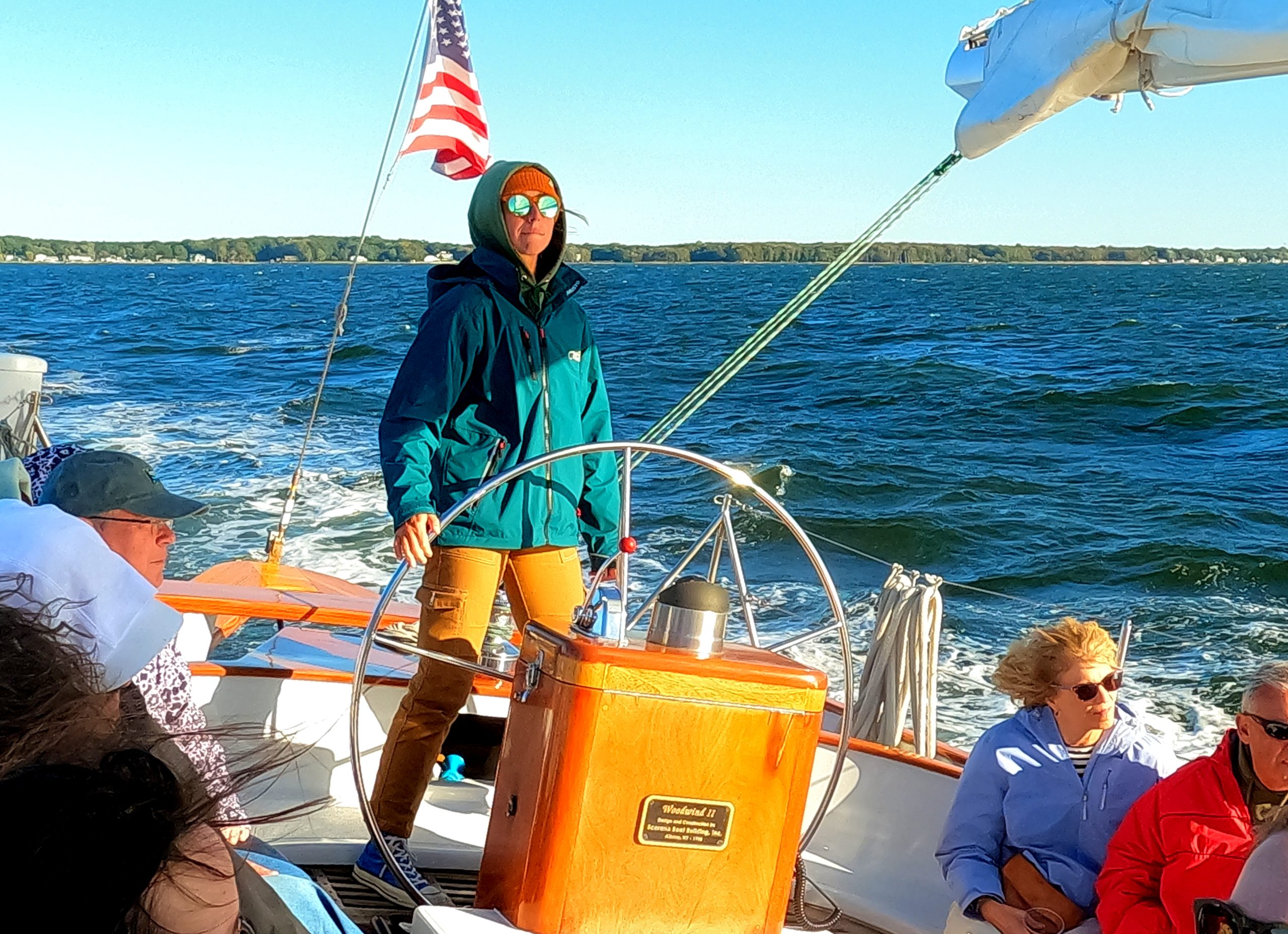 Captain Delaney at the helm of Woodwind II on a blustery fall day on the Chesapeake Bay. Photo by Steve Hock Hock of Bethlehem, PA