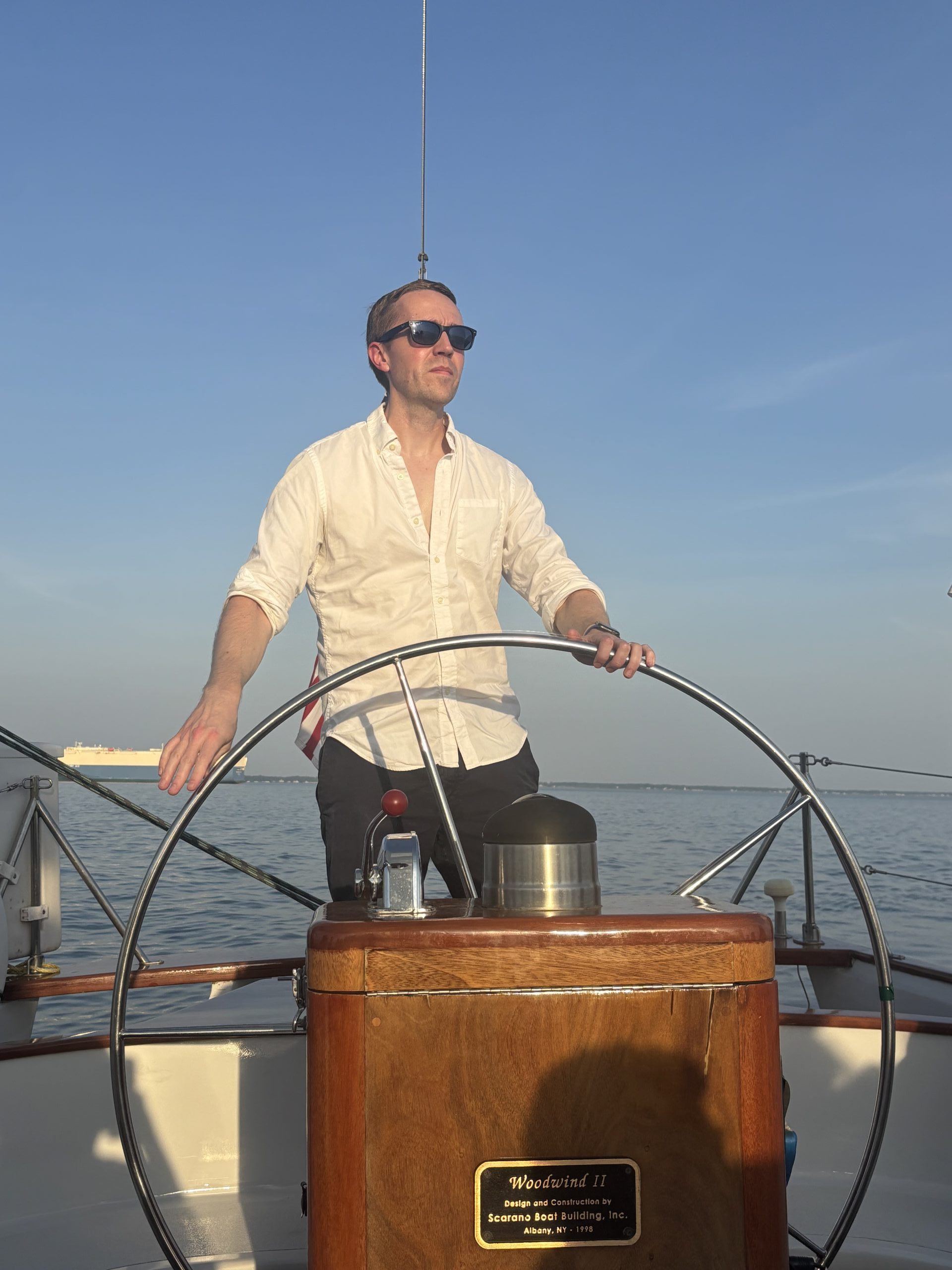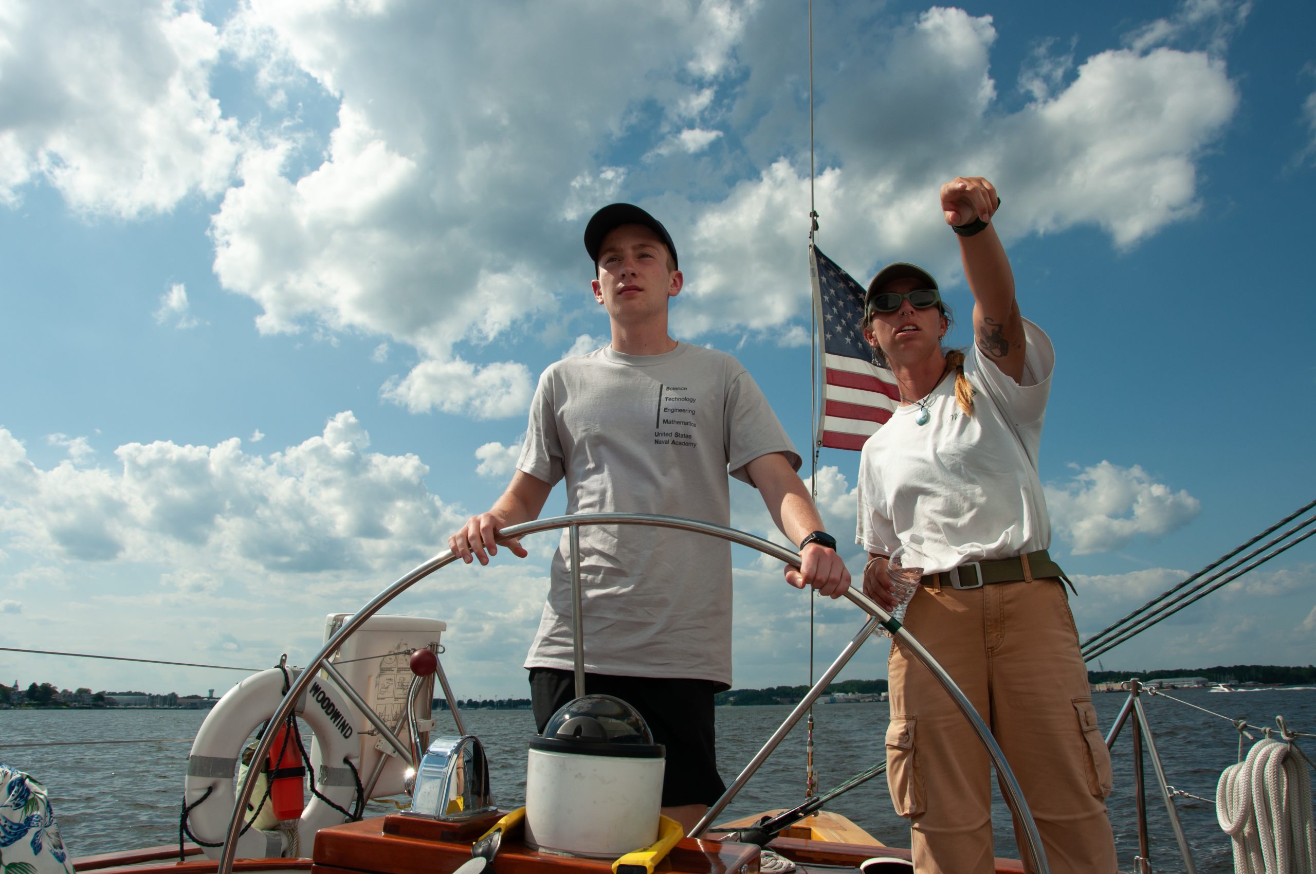 USNA hopeful Niall McKern, fresh out of Summer STEM camp, takes the helm of the Woodwind under the captain’s direction. Photo by Patrick McKern of Poulsbo, WA