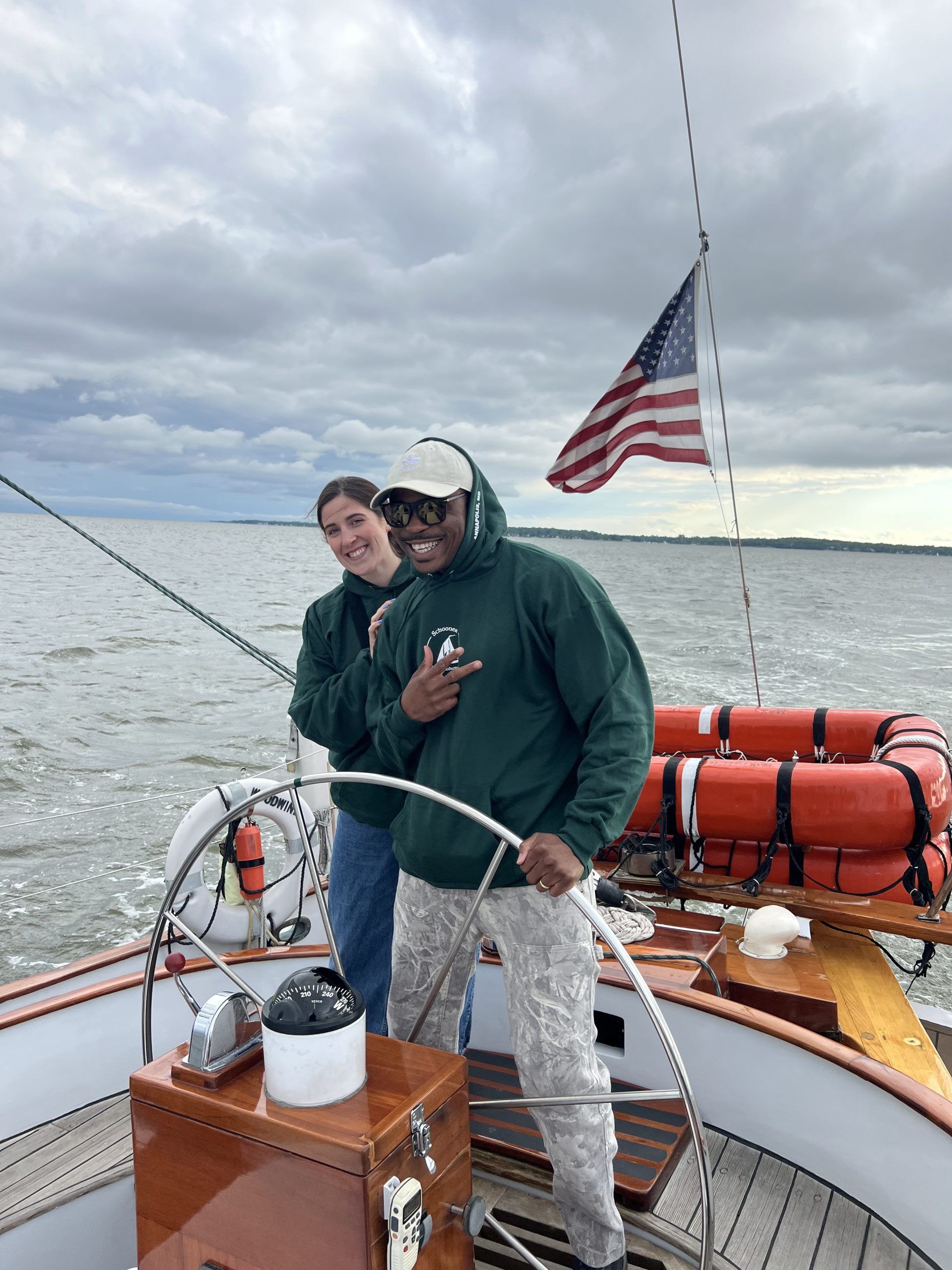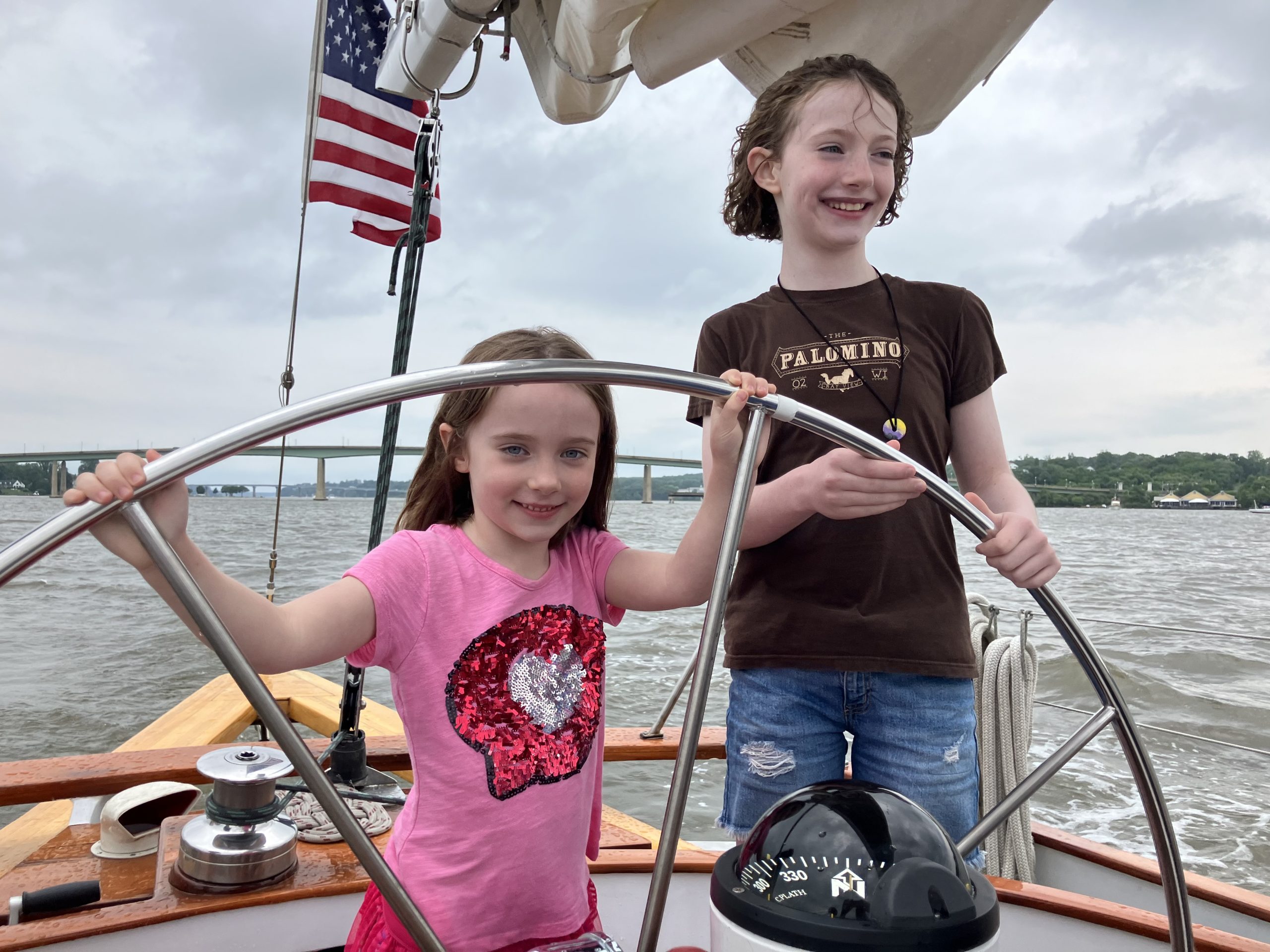 Maya and Riley at the helm – daughters of a son of a son of a sailor Photo by Ed Kenny of Greenbelt, MD