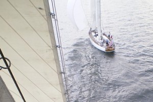 For the race, we have a sail specifically built for downwind sailing – the spinnaker. We only use it for the race. It is the big sail that is flown off our bow and is made of a very lightweight material that can fill much more easily than our traditional sails. More traditional vessels, like the Pride Of Baltimore, have square sails for downwind sailing. We need additional sail area downwind because the wind is chasing us. We cannot sail efficiently dead downwind because then the mainsail blocks the wind to the other sails.