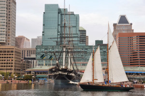 Woodwind left Annapolis for the Parade of Sail in Baltimore on Wednesday. The Parade had been canceled due to bad weather for the past three years, but as we left our dock, there was every indication that this year’s parade will finally occur. It was quite a sight to see 35 schooners parading under sail (and engine) in the inner harbor. Friendly cannon fire is typical and this year was no exception. After the Parade, the skippers and crew all socialize at a “all hands” party in Fells Point. It’s always a special time to see old friends from previous races.