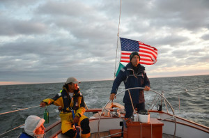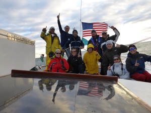 “As the colors started to change in the sky when dawn approached, we found no one around us. We looked at the Race tracker on the website, and thought – we may have this one!” says Captain Jennifer Kaye. She added, “We had about 20-30 miles to go, and we were all getting excited. The wind started to settle down as well, and I looked at our wind gauges and saw under 15 knots of true wind. I quickly said- do we want to win this thing? Groggy people said yes. I then proclaimed, well let’s get back up our fisherman sail… we are in it to win it!”