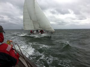 Looking at the conditions this year, the wind started from the North (from behind), in light air, then dying off and turning South, against the direction of desired travel and strengthening to moderate – strong conditions. Finally, by early morning the wind shifted to the West, with moderate strength, which is the best direction for fastest sailing for all members of the fleet. Because of the wide variety of conditions, most vessels were able to finish within the time allotted.