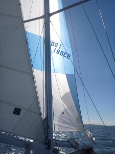 But… it wasn’t anything like that. Because we were sailing downwind, the speed of our vessel was subtracted from the wind speed and it was a fast and comfortable sail down the bay in 18-20 knot breezes.
