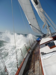 As nightfall came, we were behind Imagine and Adventurer, and crossing jibes with the newly built Schooner Virginia. The other schooners still in sight were Liberty Clipper and Heron. As the evening wore on, the waves and wind were building, especially as we sailed further down the bay in record time. By 9:00-10:00pm, the waves built to around six feet behind us. Our crew called out the big waves as they towered above the helmsman’s head. Surfing down the waves, our speed was increasing near 13 and 14 knots. As Captain Jen Brest was at the wheel, she called out speeds from the knot-meter 14.2, 14.9, 15.4, 16.1, 16.7 (19 mph), her voice getting louder and higher. The navigator, Rai Muhlbauer, down below then yelled back- “you hit the record on the GPS, 16.5 knots”! Our speed record before that was a mere 15 knots, during the schooner race of 2002.